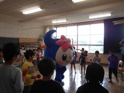 授業ではさっかちも参加し、子供たちと一緒に鳴子をもって踊ってくれました!